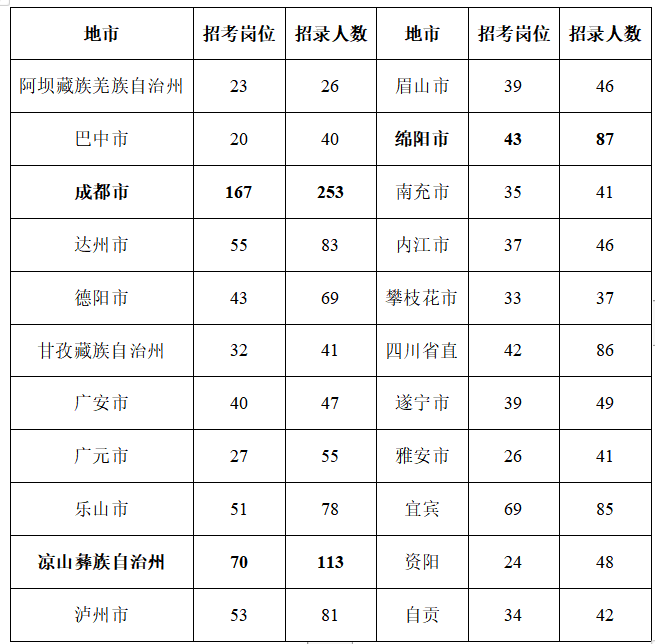 国考四川省的招录职位数和招录人数最多的地市是成都市,今年招录人数:253人,职位数:167个,占全省招录人数的16.9%。招录人数排名第二和第三的部门是凉山州(113人)和绵阳市(87人)。具体数据如下: