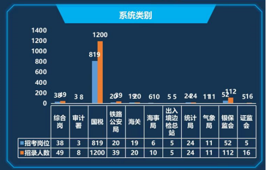 国考四川省招录公务员涉及的系统有国税、审计、海事、海关等11个系统,其中招录人数最多的是国税系统,1200人占到了整体招录的80.3%,其次是银保监会招录112人。具体数据如下图: