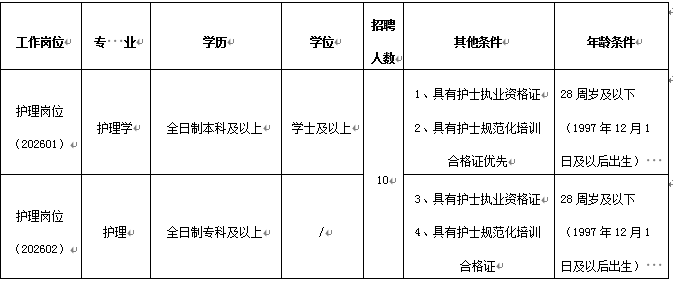 本次计划招聘护理人员10名,主要从事护理工作,具体招聘岗位、学历、专业等要求见下表: